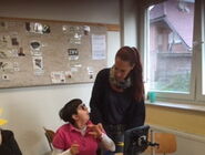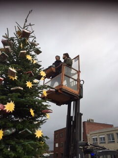 Wir haben Kartonagen im Keller geholt. Diese mussten wir falten, zusammenkleben und stapeln. Sterne, die wir vorher aufgezeichnet haben, wurden ausgeschnitten und gelocht. 80 Stück. Das war viel Arbeit. Mit der Drahtschere wurden Befestigungsdrähte abgeschnitten. Dann haben wir die Kartonagen und Schachteln verpackt. In Geschenkpapier und Folie. Bänder und Drähte dran gemacht. Alles wurde in blaue Säcke für den Transport verpackt. Zwei Schülerinnen sind mit Frau Backes-Knauer vorgegangen und haben den Hubwagen bei der Firma bestellt. Bis Herr Rütten mit den anderen kam, haben wir schon unten am Baum Sachen aufgehängt. Dann ist immer einer mit Herrn Rütten oder Frau Backes-Knauer hochgefahren. Die Dekoration mussten wir gut festmachen und den Draht um die Zweige wickeln. Als wir fertig waren sind wir zu Frau Bröckskes-Wetten ins Büro gegangen, Herr Bröckskes ist auch gekommen und Frau Peters hatte wieder tolle Sachen für uns gekauft. Süßigkeiten und Trinkpäckchen. Die restlichen Süßigkeiten haben wir mit zur Schule genommen und am Montag in den 4 BPS Klassen verteilt. Der Baum sieht toll aus. Wir freuen uns schon auf das nächste Jahr. Dann machen wir auf jeden Fall auch Engel.