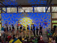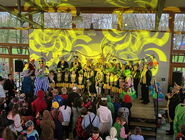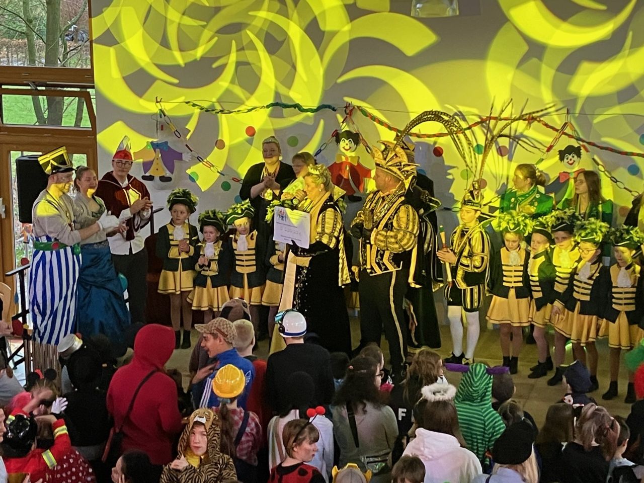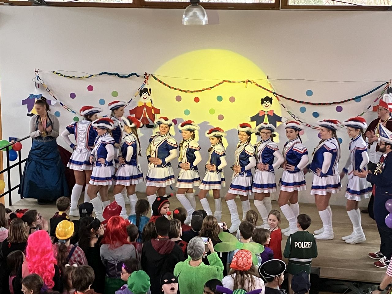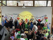 Nach einer Stärkung mit allerlei Leckereien wurde auf und vor der Bühne bei bester Laune weitergefeiert. Hierbei begrüßten Obelix und der Clown verschiedene Klassen und die beiden Schulchöre auf der Bühne. Den Abschluss bildeten mehrere tolle Darbietungen der Tanzgarde von Alt Viersen.