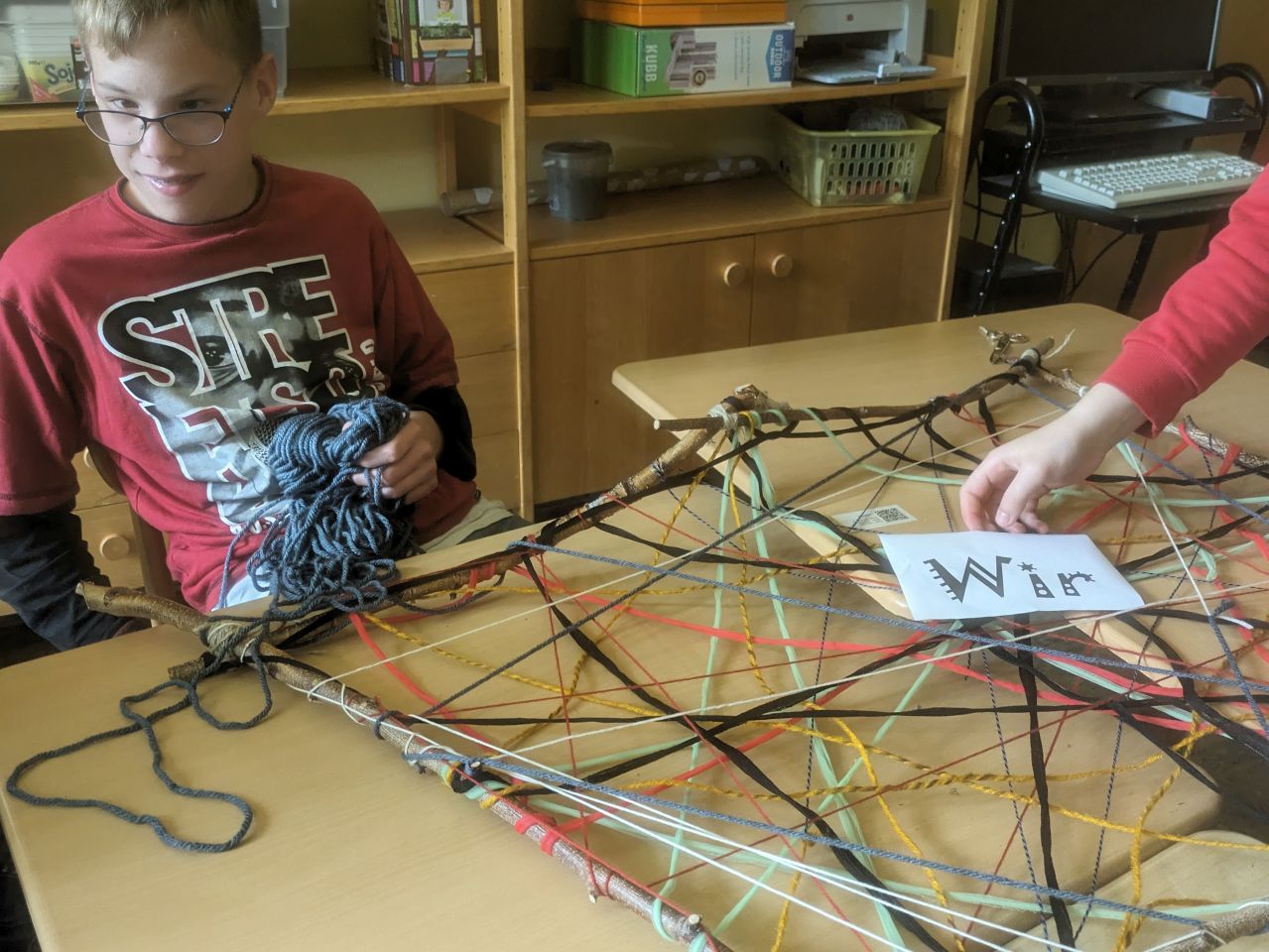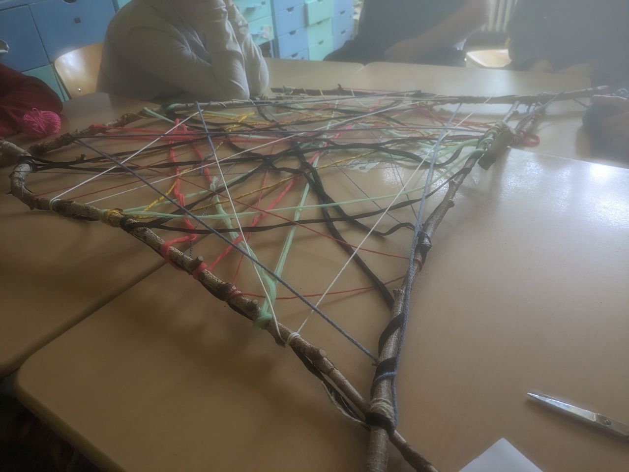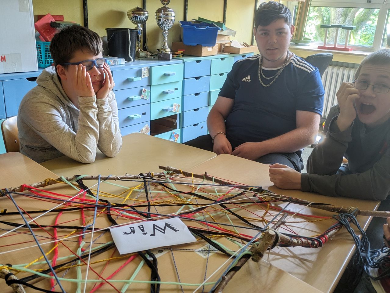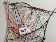 Wir haben ein WIR-Netz alle zusammen gemacht. Aus Fäden und Stöcken. Wir mussten ganz schön aufpassen, als wir uns die Wollknäule zugeworfen haben. Auch das Knoten war gar nicht so einfach. Das hat aber viel Spaß gemacht. Unser Netz ist toll geworden! Es hängt jetzt im Flur vor unserer Klasse.