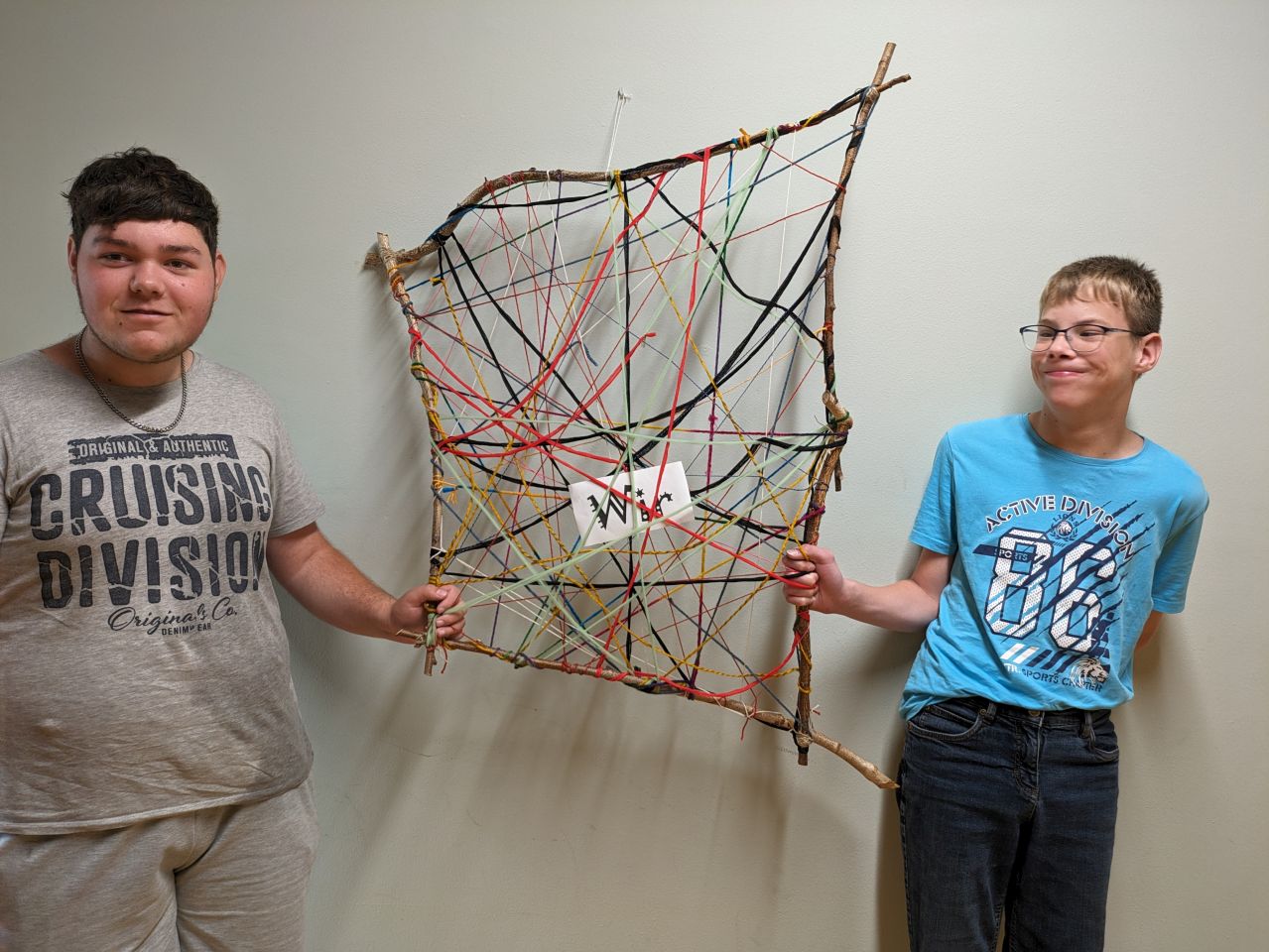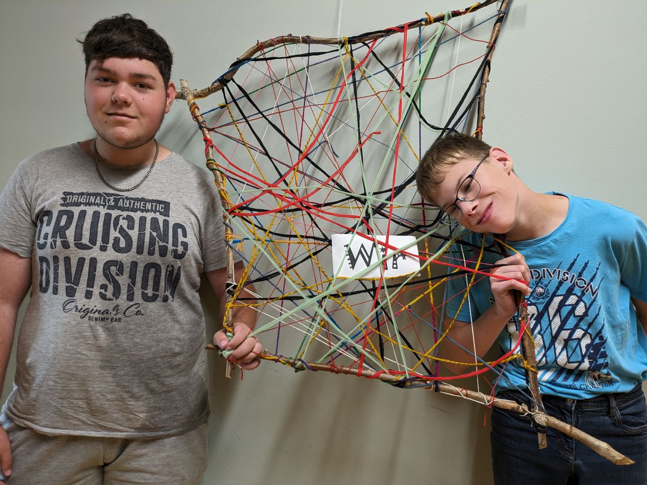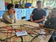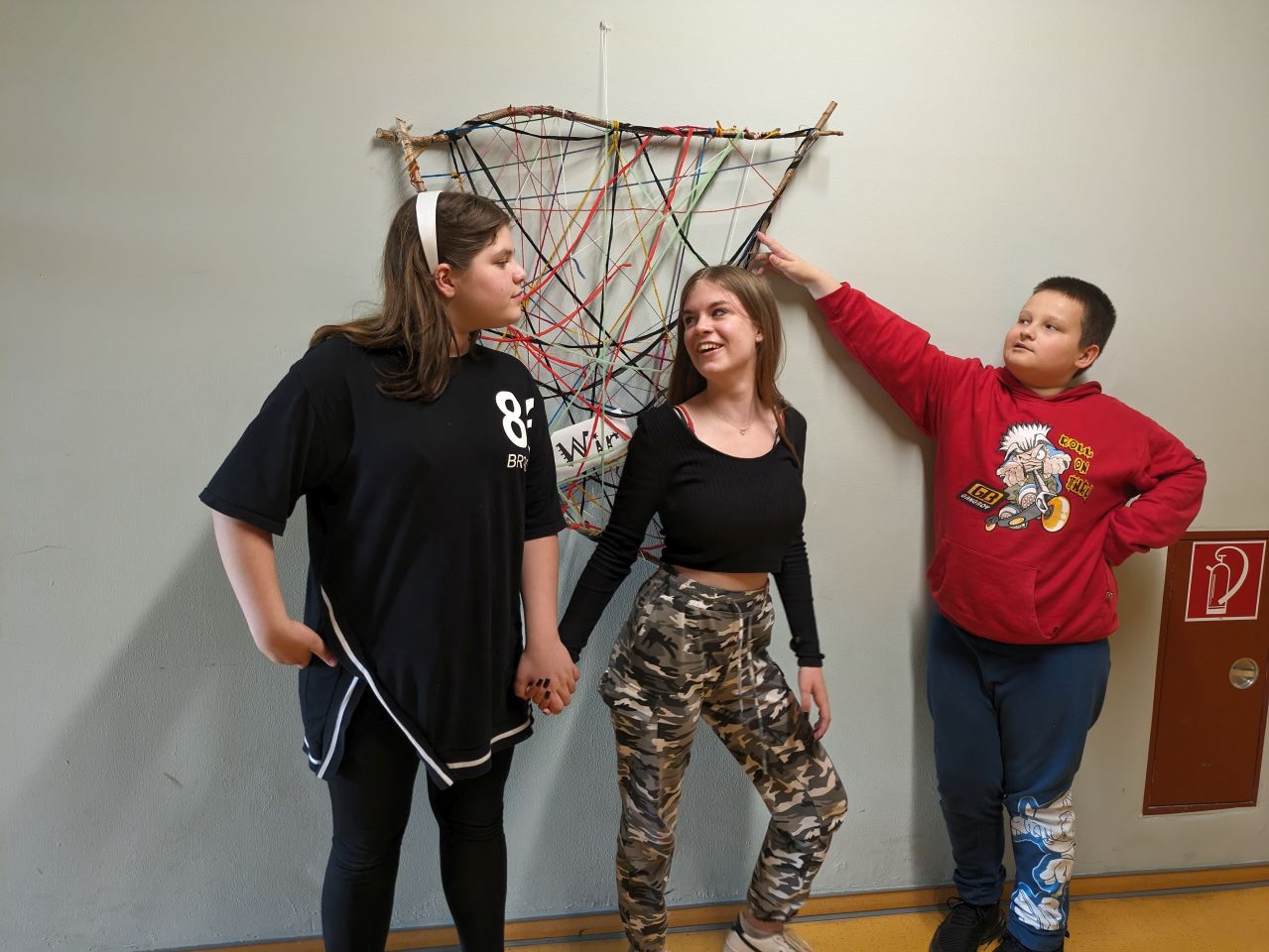 Wir haben ein WIR-Netz alle zusammen gemacht. Aus Fäden und Stöcken. Wir mussten ganz schön aufpassen, als wir uns die Wollknäule zugeworfen haben. Auch das Knoten war gar nicht so einfach. Das hat aber viel Spaß gemacht. Unser Netz ist toll geworden! Es hängt jetzt im Flur vor unserer Klasse.