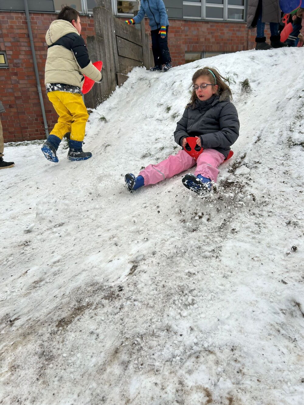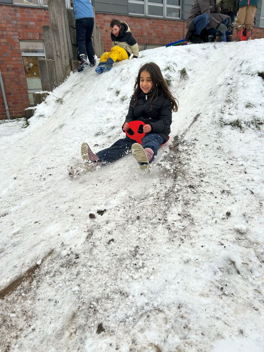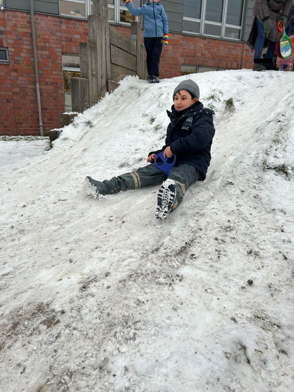 Zu Beginn des neuen Jahres, überraschte das Wetter mit viel Schnee. In der Pause hatten die Schüler*innen viel Spaß, bauten Schneemänner und rutschten auf Rutschtellern den Hügel hinunter.