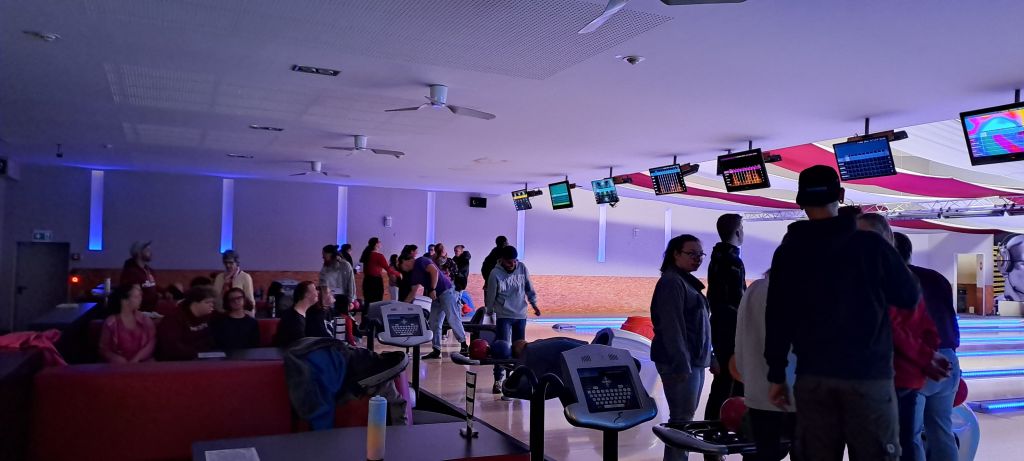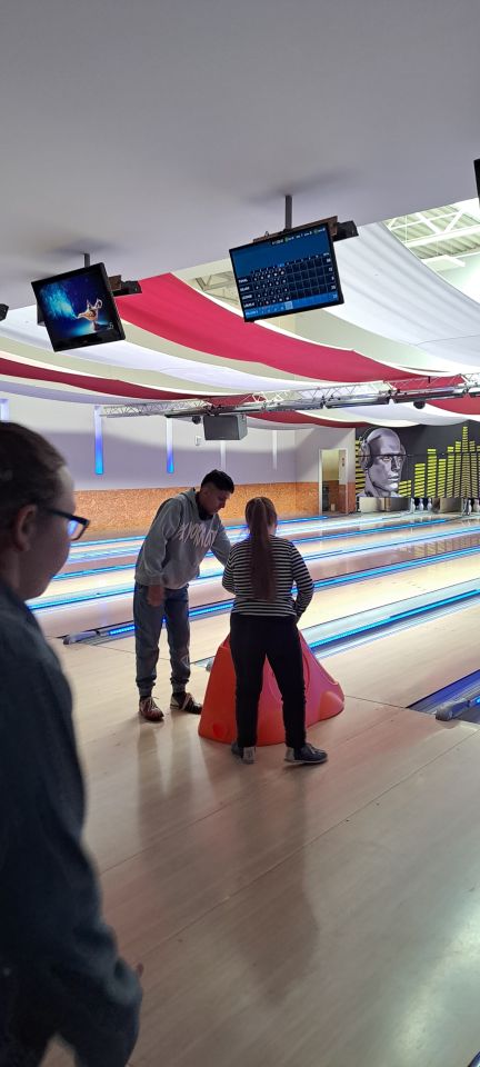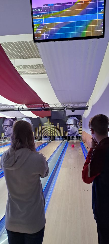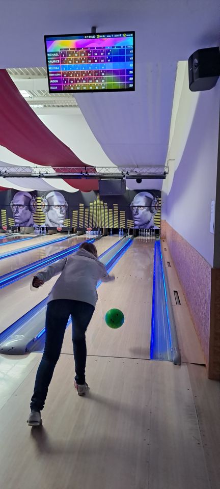Am Montag ging es zum Bowling Center nach Mönchengladbach. Wir sind mit dem Linienbus hin- und zurück gefahren. Der Bus war auf dem Hinweg ganz schön voll, viele mussten stehen. Auf dem Rückweg auch einige. Wir haben ein Getränk getrunken (Sprite, Apfelschorle oder Wasser). Das Bowling war schön, hat Spaß gemacht und war lustig. Manche haben mit Bande, die meisten ohne gespielt.