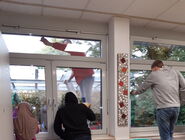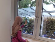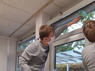 Nachdem der Klassenraum der B4 fertig gestrichen ist und sehr gut geworden ist, stehen einige Reinigungsarbeiten an. Auf den Bildern seht ihr uns, wie wir die Fenster putzen. Wenn wir später in einer eigenen Wohnung wohnen möchten, müssen wir das auch können.