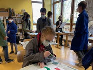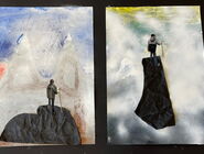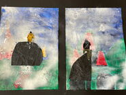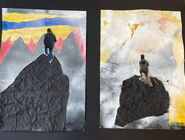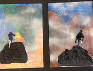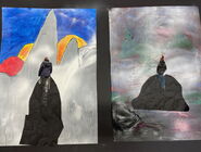 Wir haben Sprühkreide auf die Bilder gesprüht, damit es wie Nebel aussieht. Wir haben noch Haarspray darauf gesprüht, damit die Kreide hält. Wir haben schwarzes Papier geknüllt und einen Berg daraus geschnitten. Dann haben wir den Berg und unser Foto auf das Bild geklebt. Zum Schluss haben wir das fertige Bild auf schwarzen Tonkarton geklebt. Die Bilder sind toll geworden.