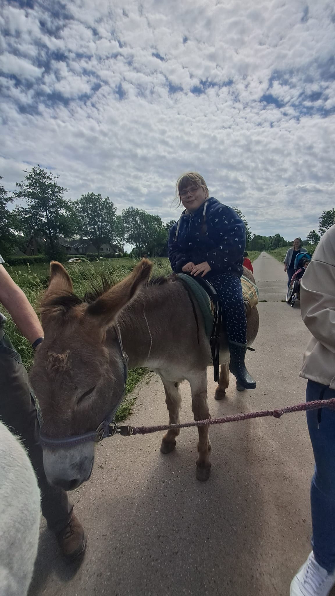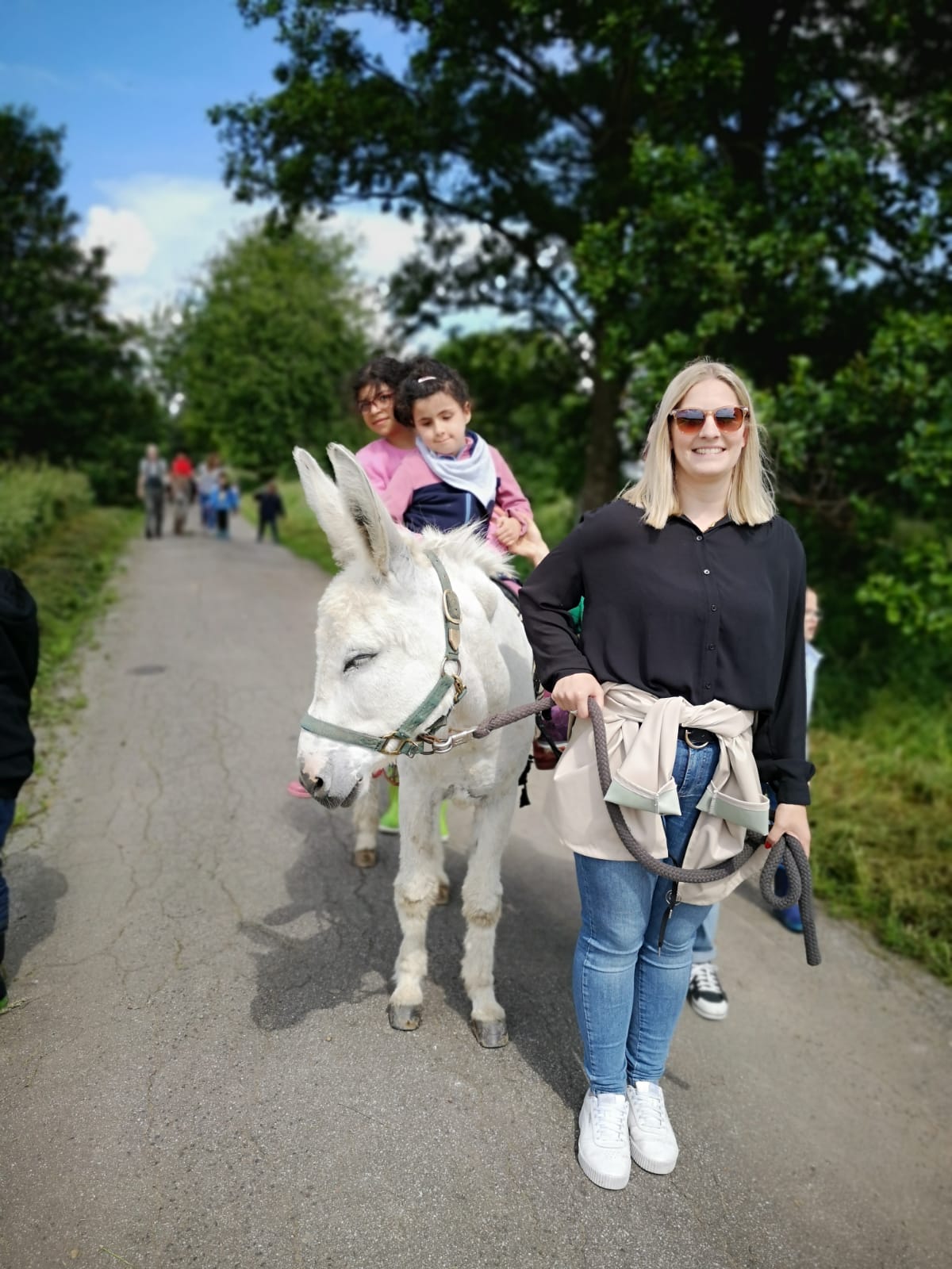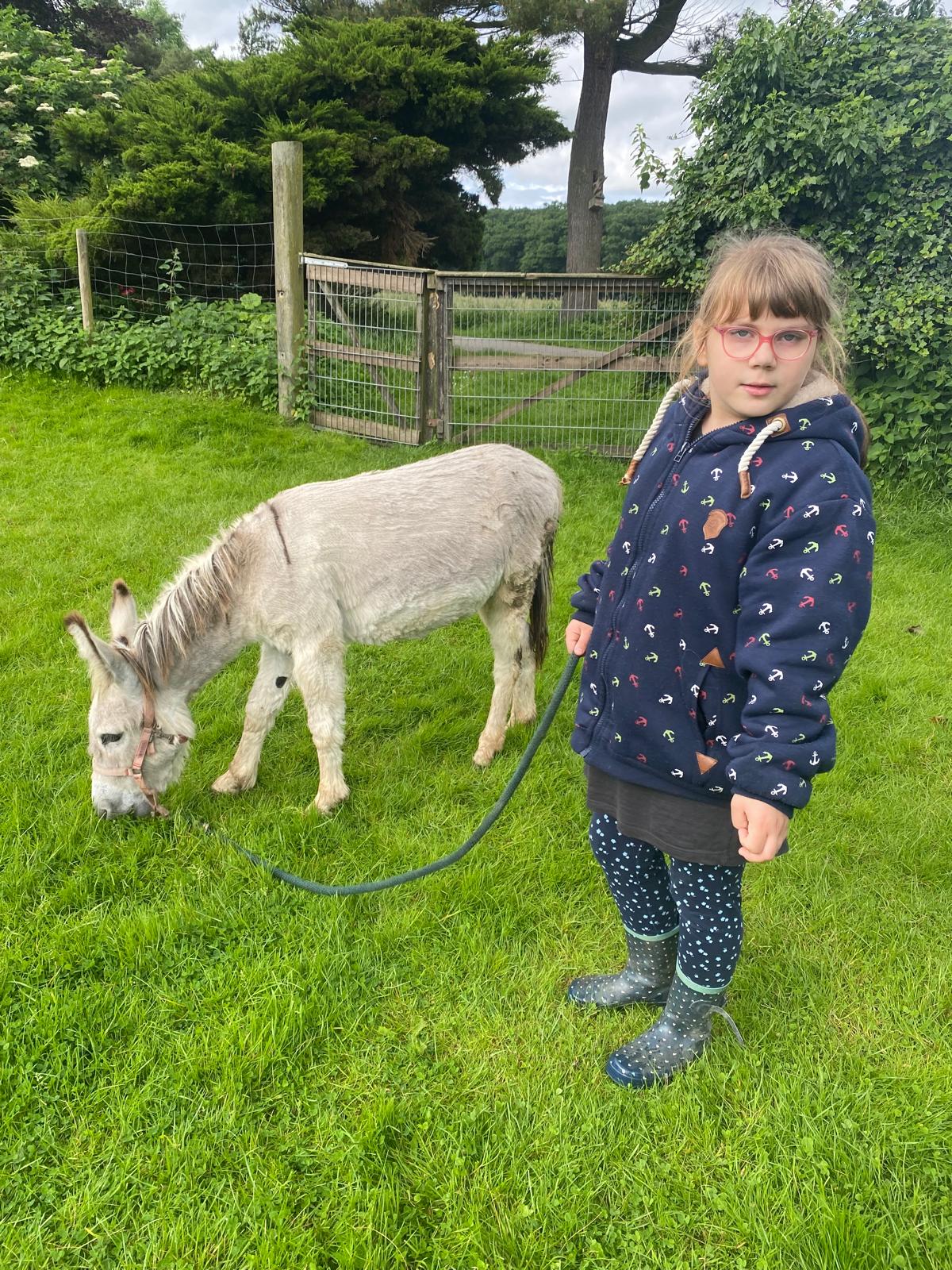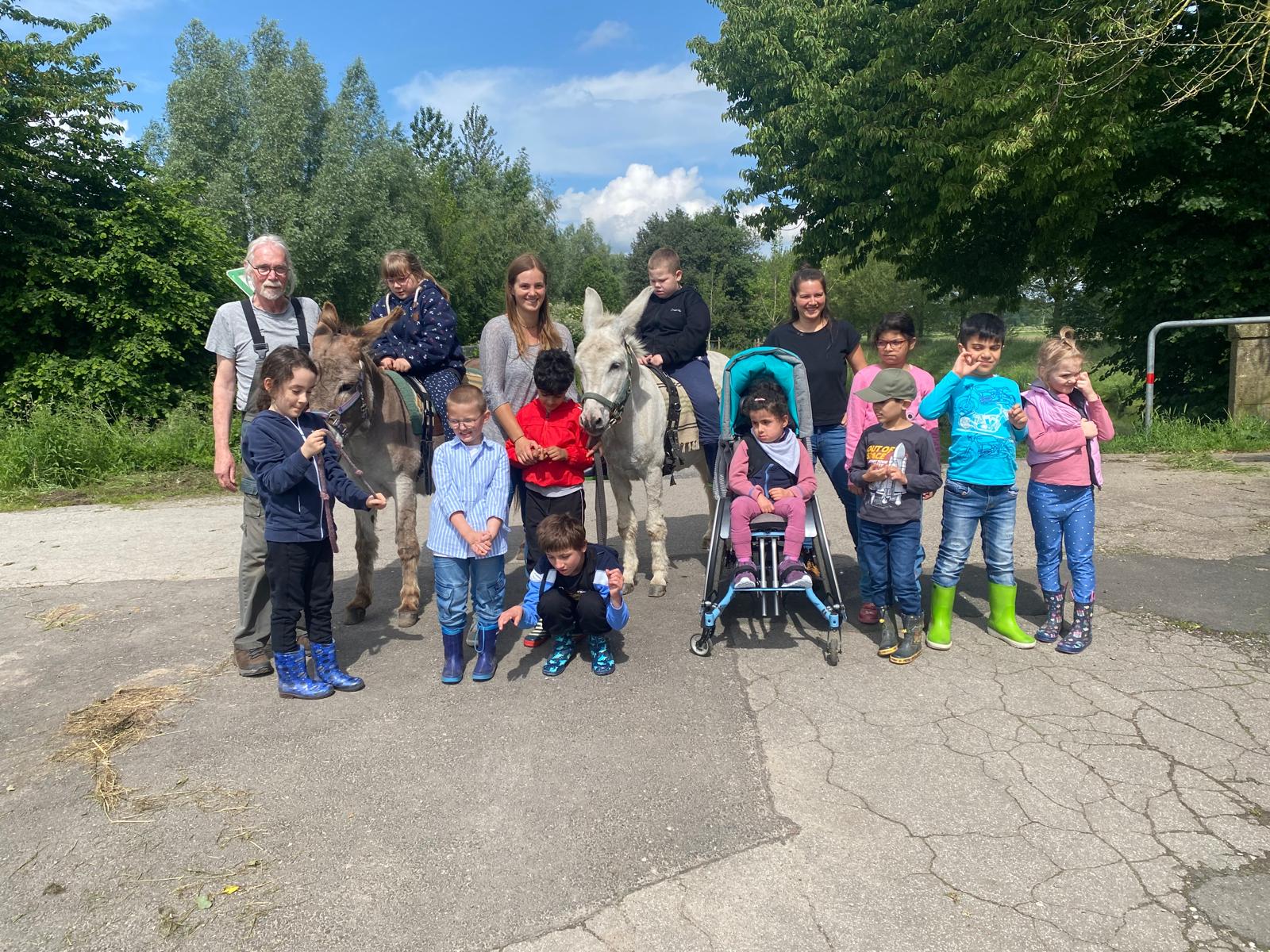 Nach einem gemeinsamen Frühstück war es dann soweit, wir sind gemeinsam mit den Eseln Jolly und Hansi wandern gegangen. Immer zwei Kinder durften dabei auf einem Esel reiten, die anderen Kinder haben sie geführt. Das hat wirklich riesig Spaß gemacht und war ein ganz tolles Gefühl auf dem Eselrücken. Alle Kinder haben sich getraut auf den Eseln zu reiten und waren mächtig stolz. Nach einer großen Runde entlang der Niers ging es wieder nach Hause, wo die Esel wohlverdient auf die Wiese durften und wir müde aber glücklich wieder in die Schule gefahren sind.