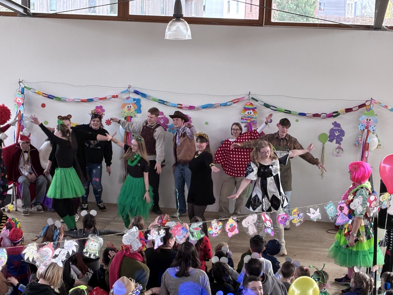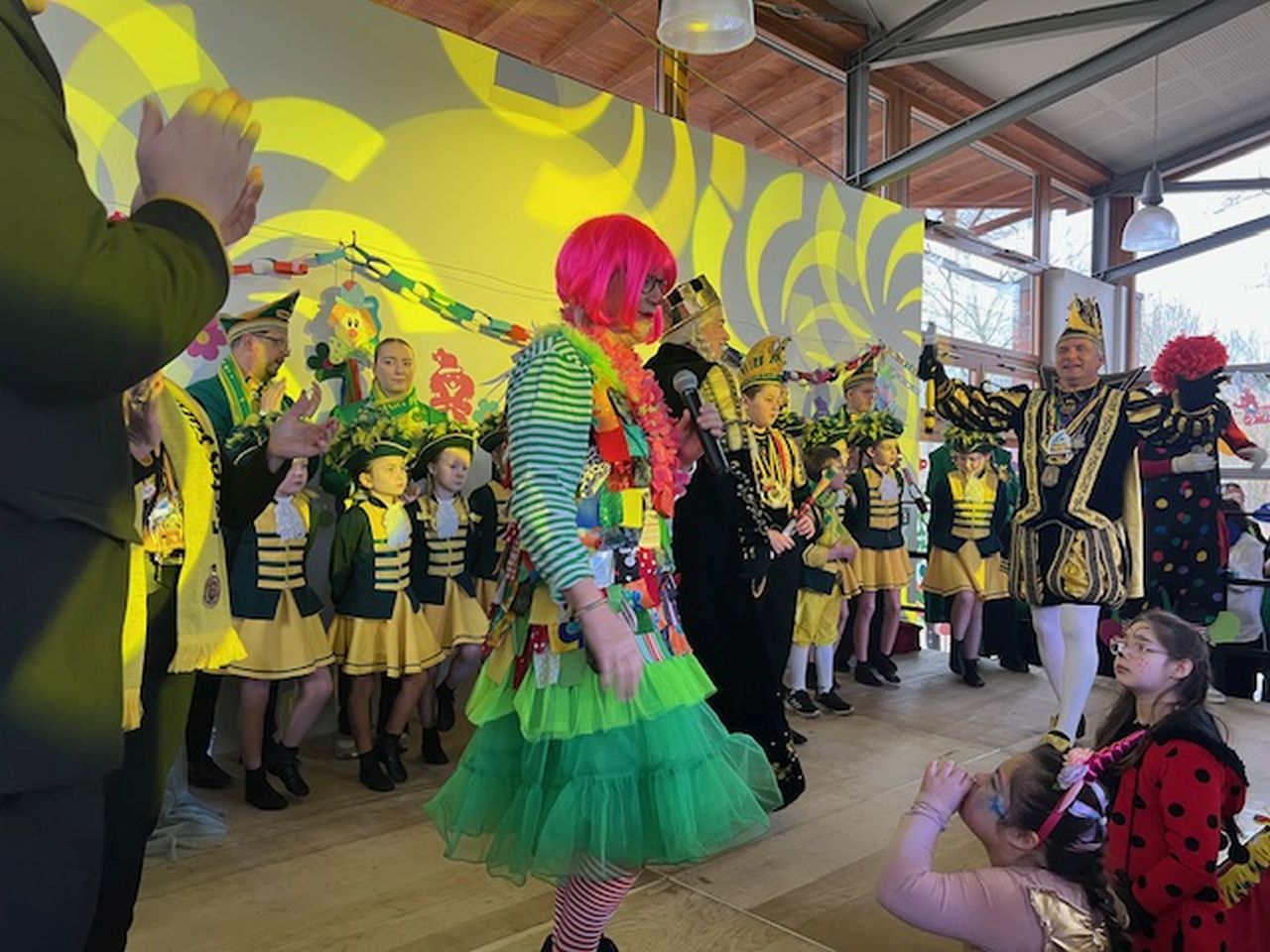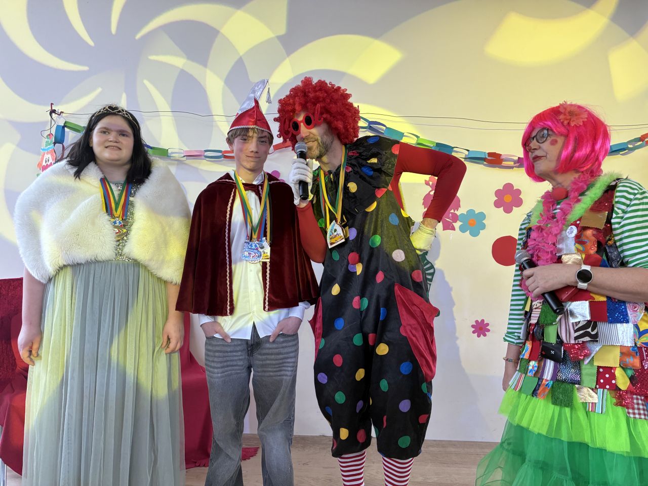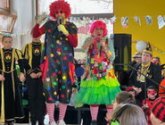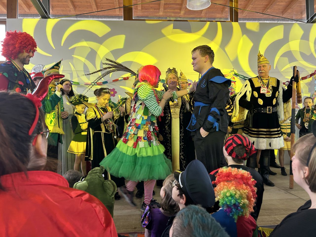 Durch das Programm führten wieder zwei lustige Clowns. Das Prinzenpaar der Schule half tatkräftig mit und verteilte Orden. Jecke Auftritte zeigten die Tanz AG der Franziskus-Schule, viele Klassen und auch die Freiwilligen. Euch allen ebenfalls ein fröhliches und jeckes Danke!