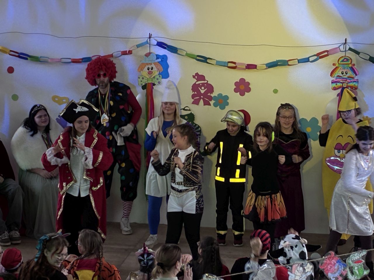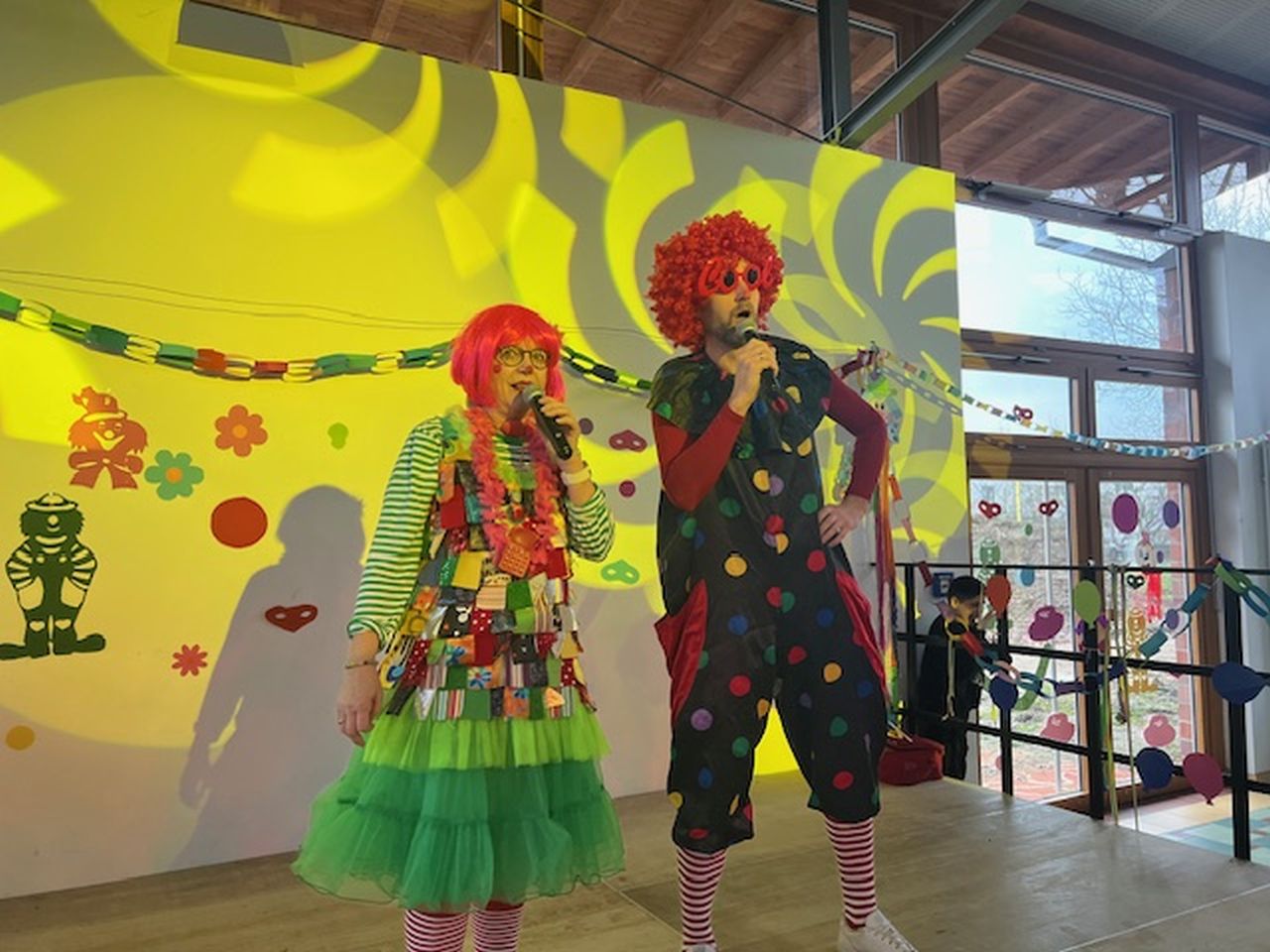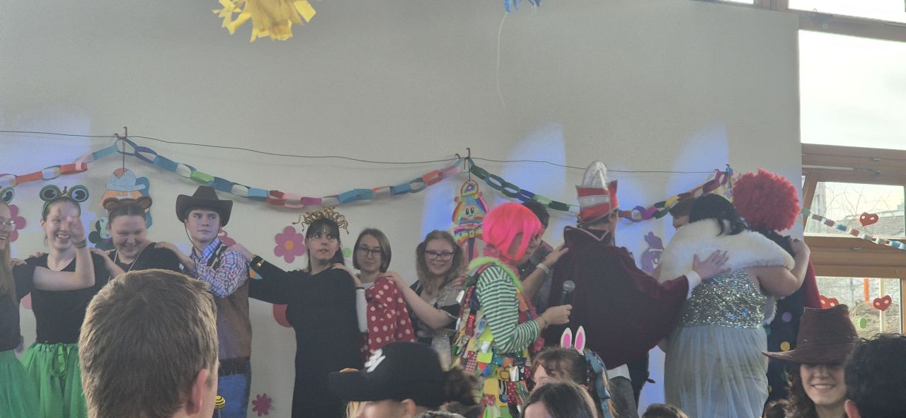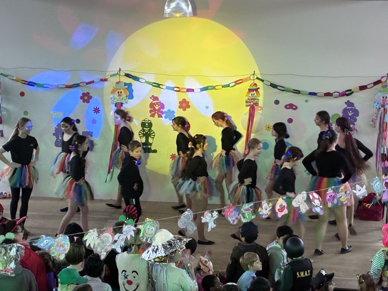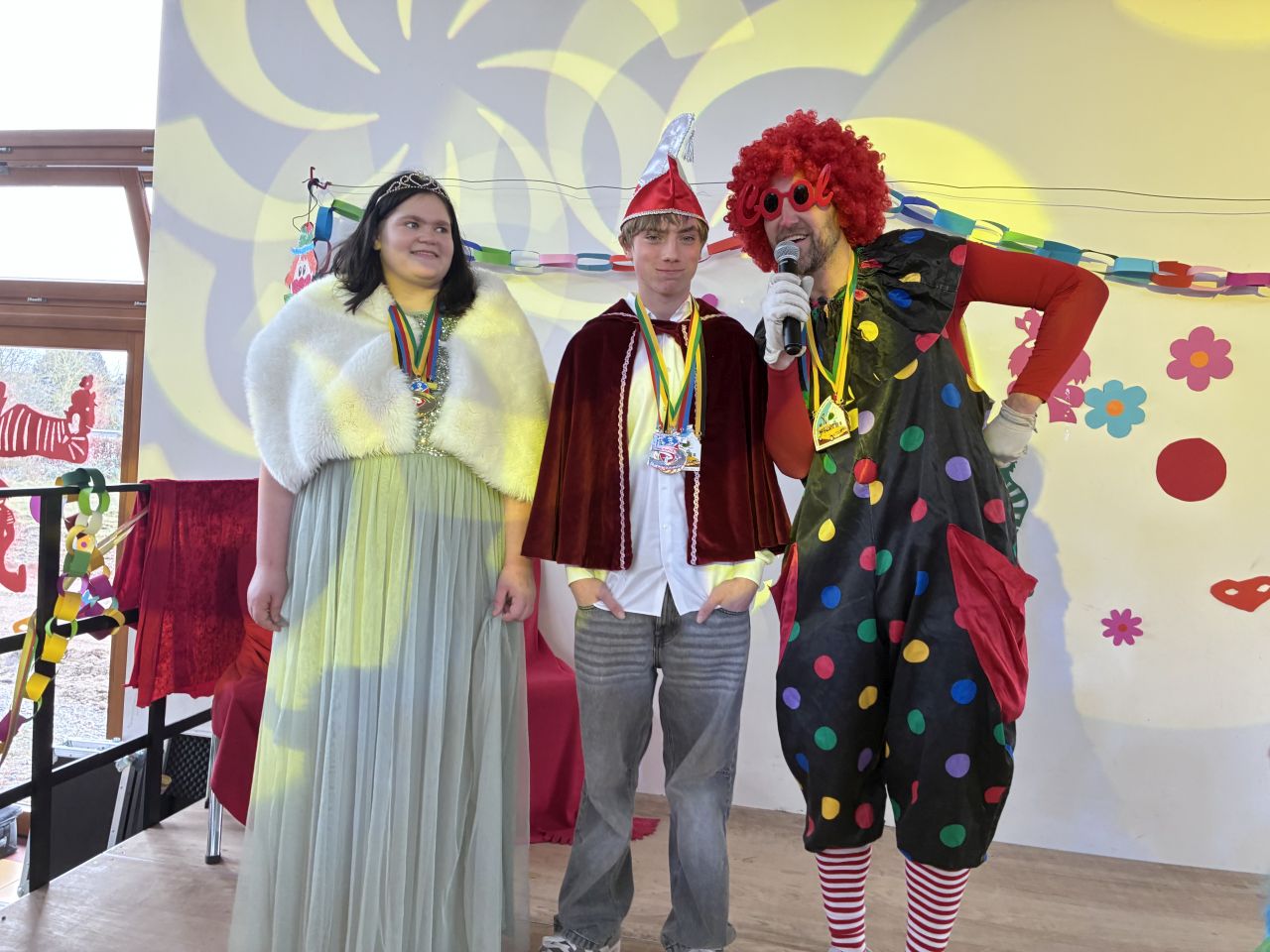 Durch das Programm führten wieder zwei lustige Clowns. Das Prinzenpaar der Schule half tatkräftig mit und verteilte Orden. Jecke Auftritte zeigten die Tanz AG der Franziskus-Schule, viele Klassen und auch die Freiwilligen. Euch allen ebenfalls ein fröhliches und jeckes Danke!