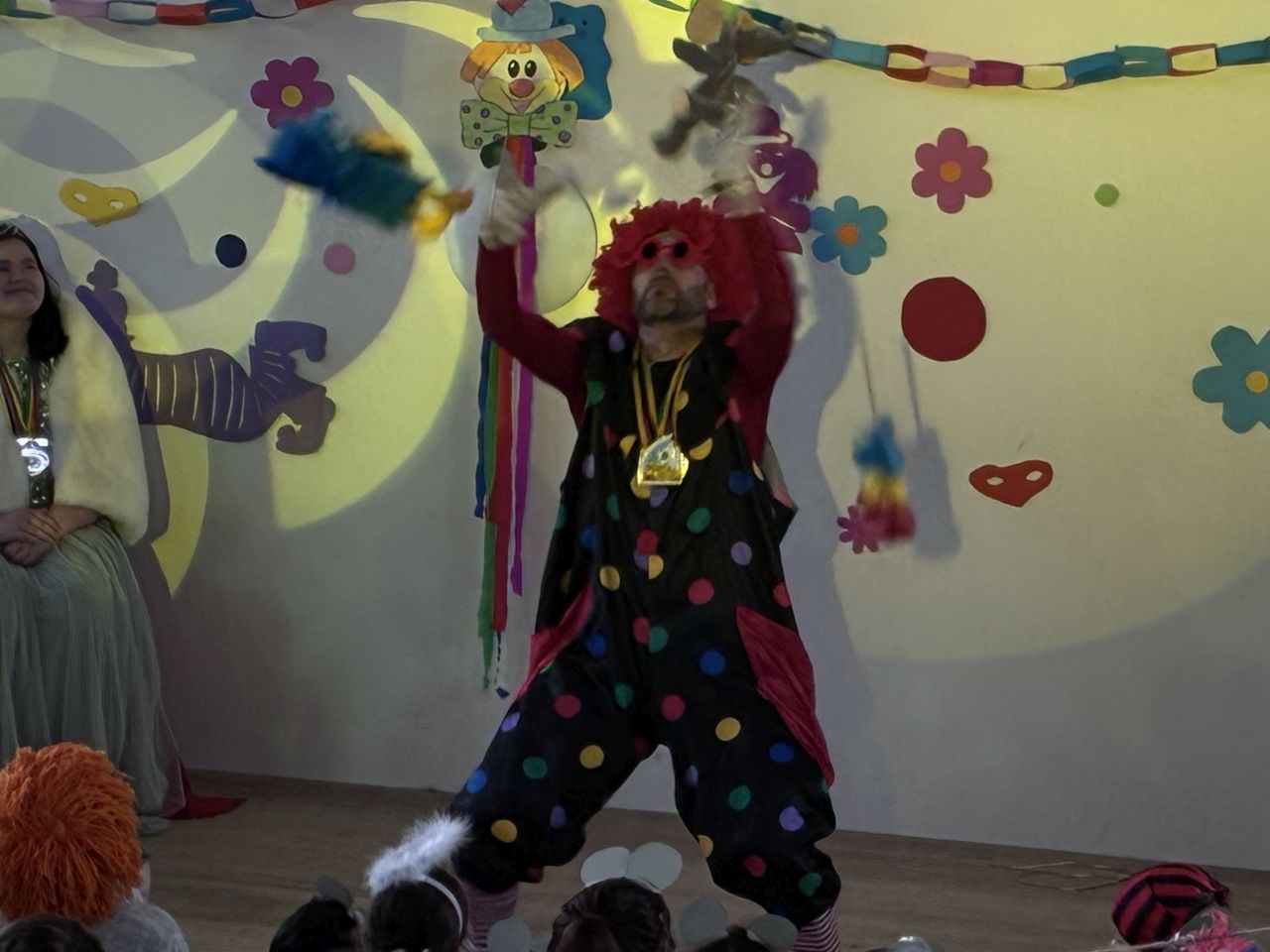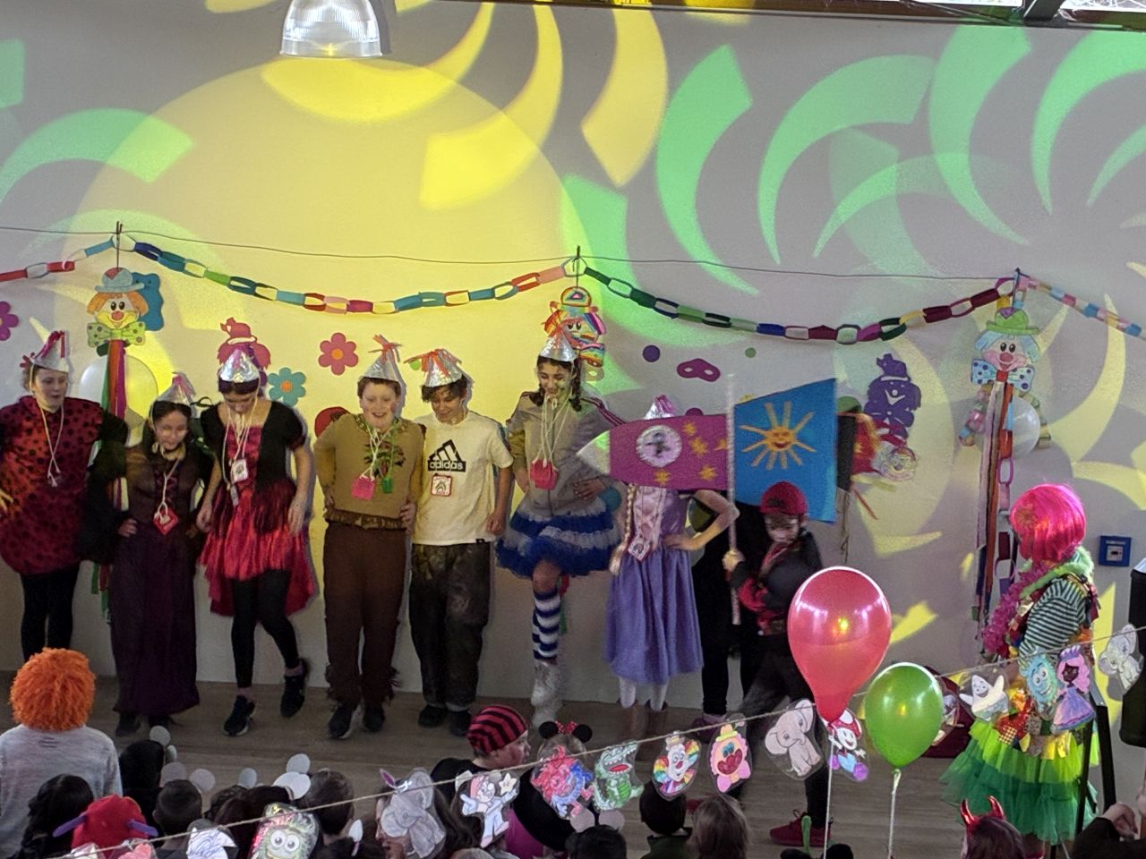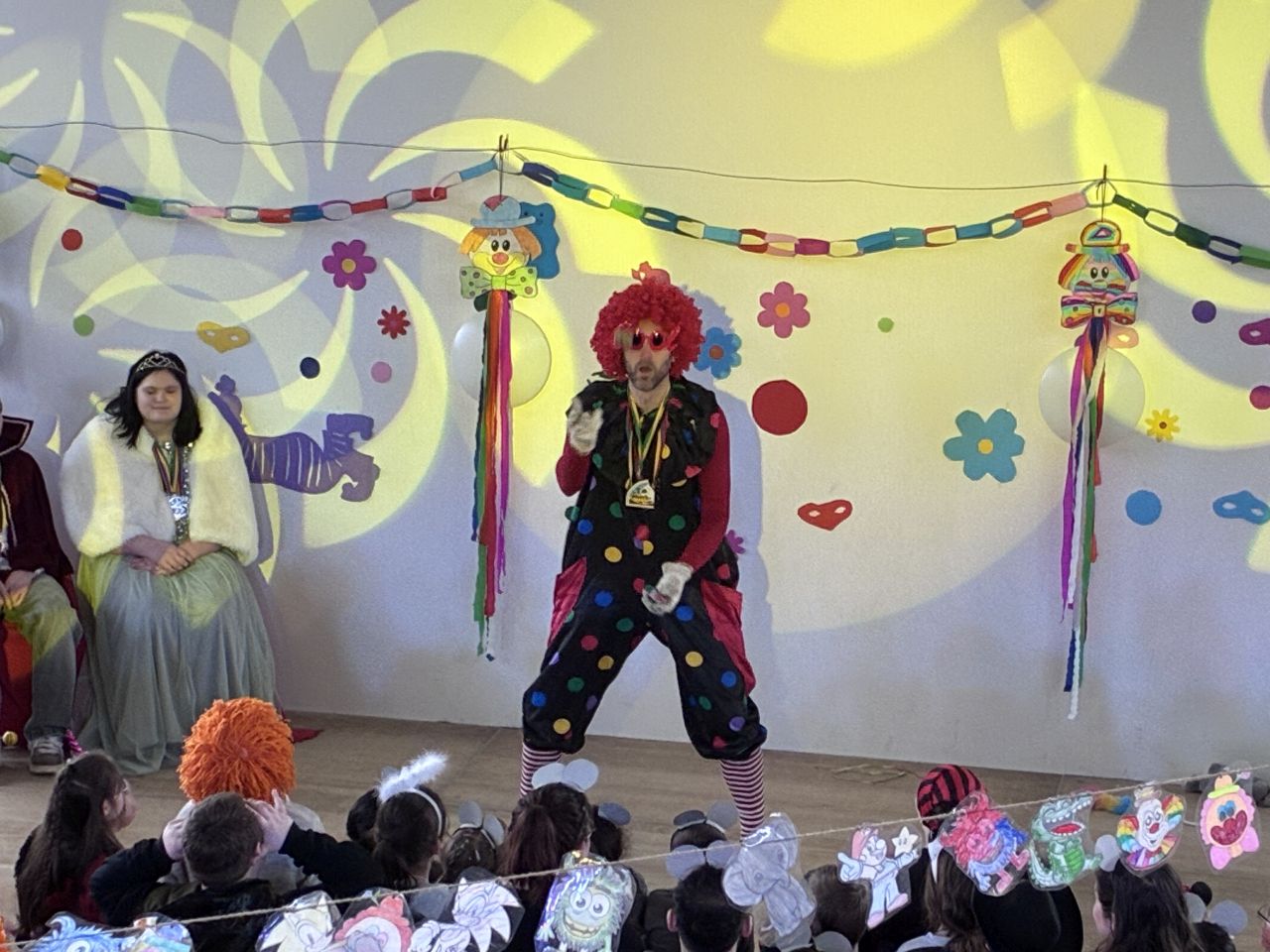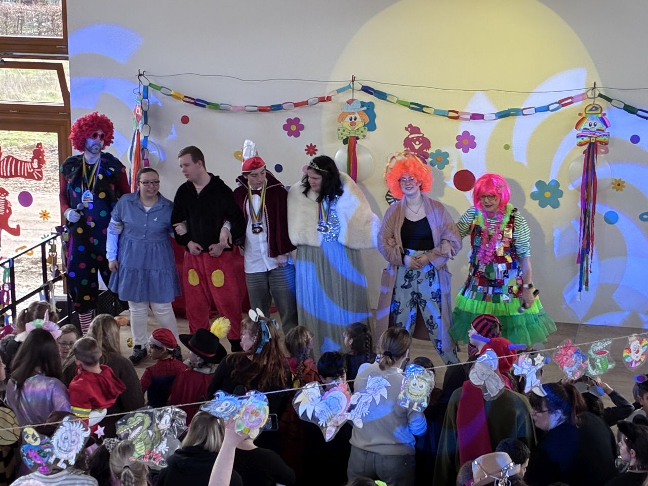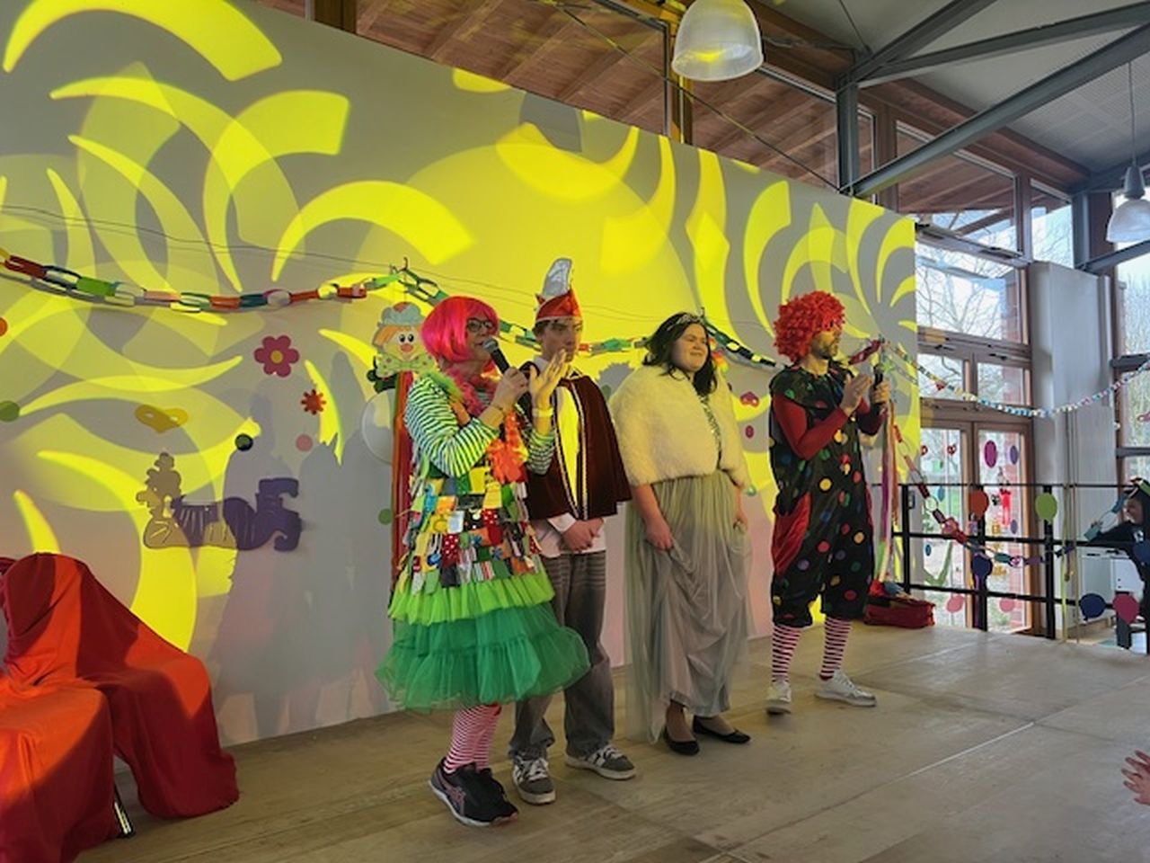 Durch das Programm führten wieder zwei lustige Clowns. Das Prinzenpaar der Schule half tatkräftig mit und verteilte Orden. Jecke Auftritte zeigten die Tanz AG der Franziskus-Schule, viele Klassen und auch die Freiwilligen. Euch allen ebenfalls ein fröhliches und jeckes Danke!