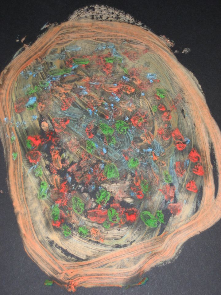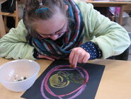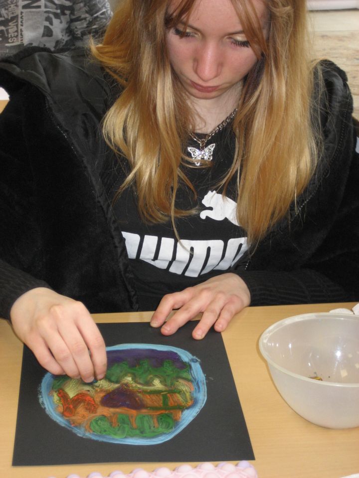 Erst haben wir für unsere Eier-Bilder ein paar Entwürfe gemacht und verschiedene Muster gezeichnet. Außerdem haben wir ausprobiert, wie wir auf schwarzer Pappe malen können. Dann ging es los. Hier siehst du uns bei der Arbeit und unsere tollen Bilder.