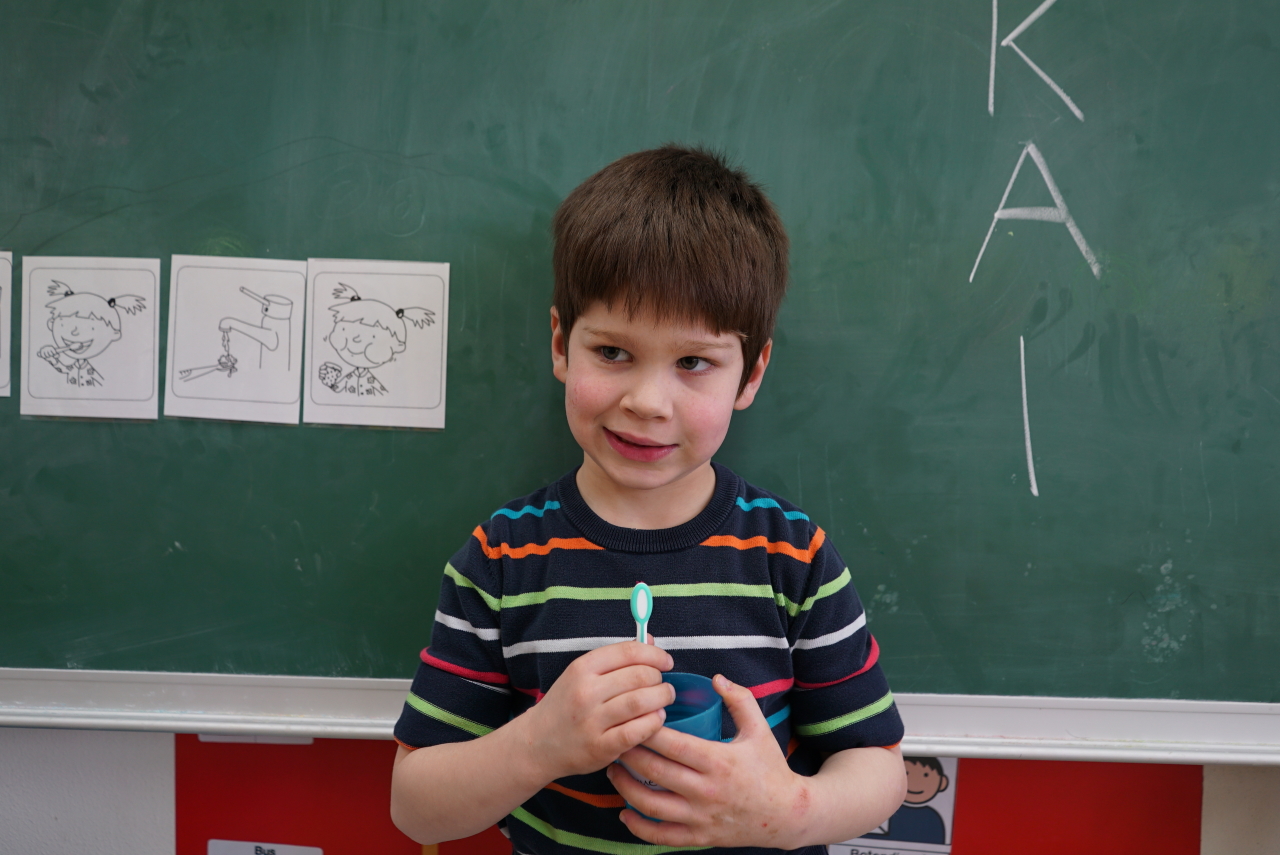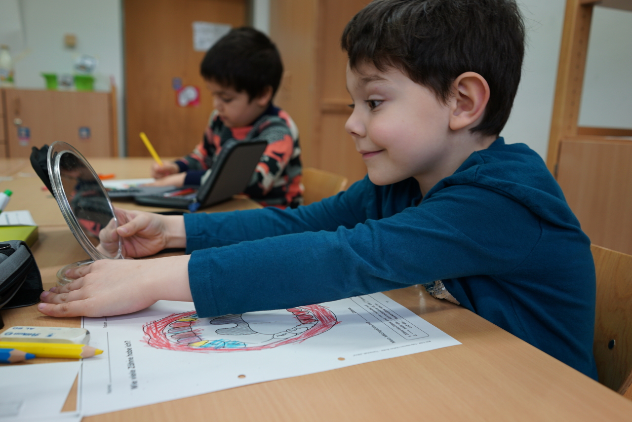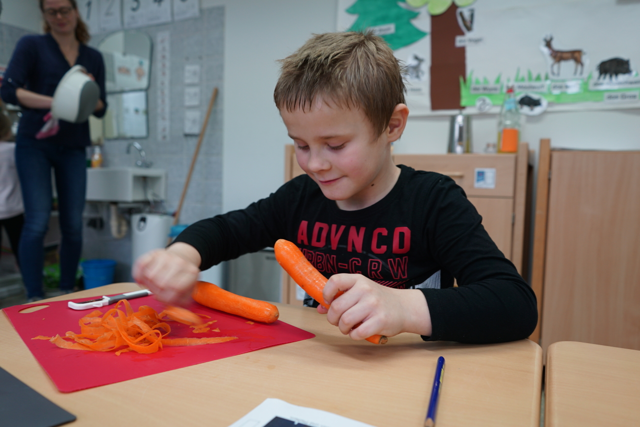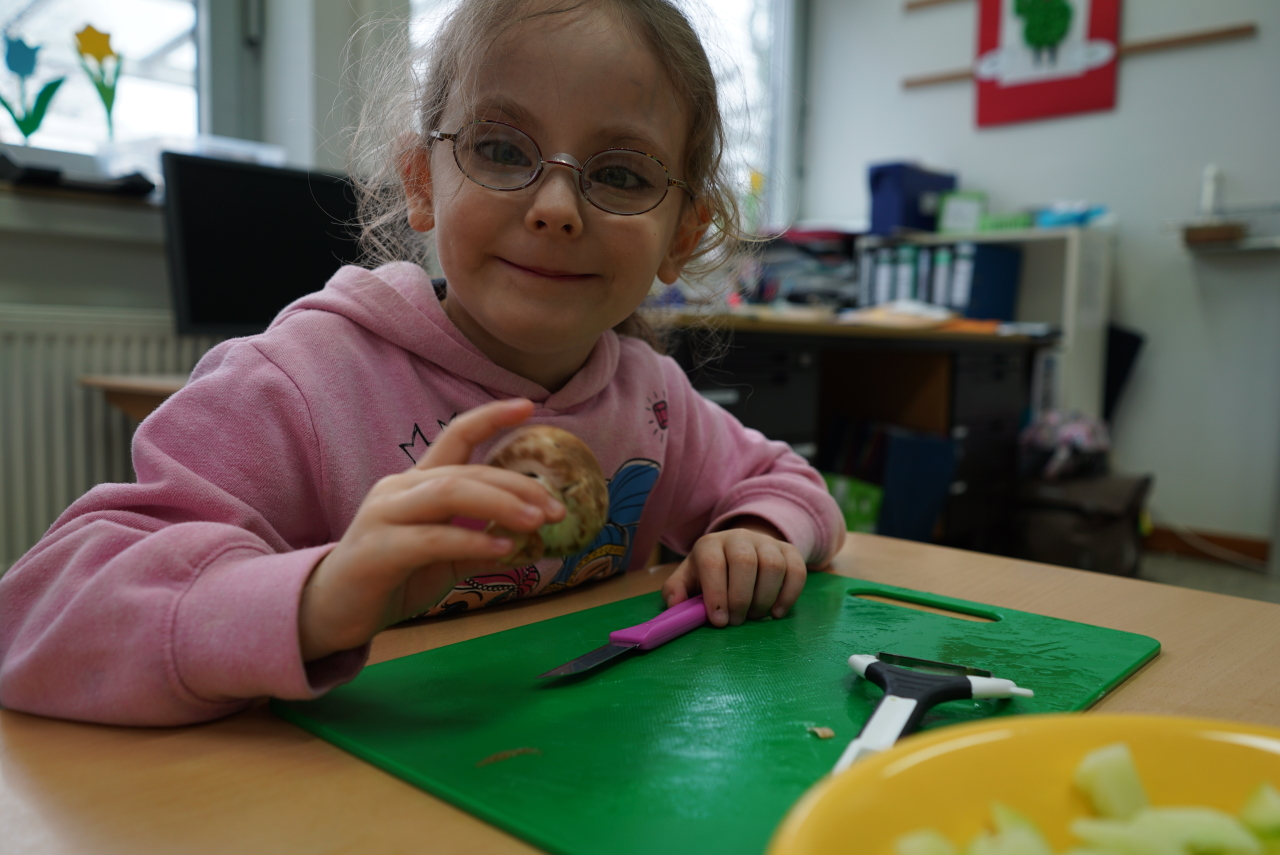 Wir haben gelernt was zur gesunden Ernährung gehört, wie man gesund kocht und wie viel Zucker in Lebensmitteln ist. Außerdem haben wir unsere Zähne erforscht. Wir haben gemeinsam Mittagessen zubereitet und Sport in der Aula gemacht.