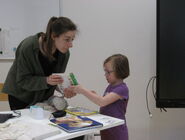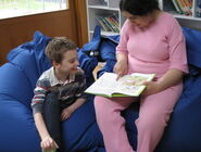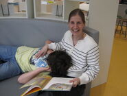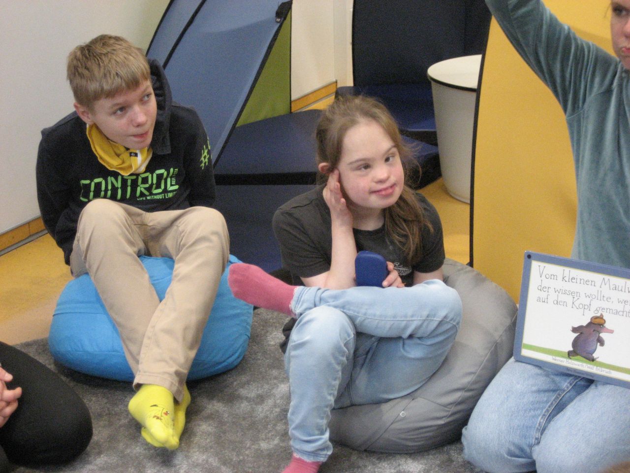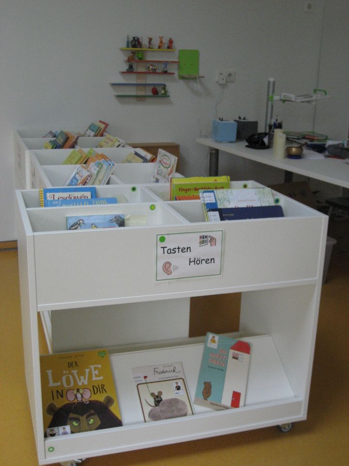 Es gibt auch ein Regal mit Tast-, Hör- und Geräuschbüchern für Schüler und Schülerinnen, die nicht lesen oder Bücher alleine anschauen können. Hierbei können Geschichten über vielfältige Sinne angesprochen und erlebbar gemacht werden. Tonie-Boxen und Tip-Toi-Bücher runden das Angebot ab.